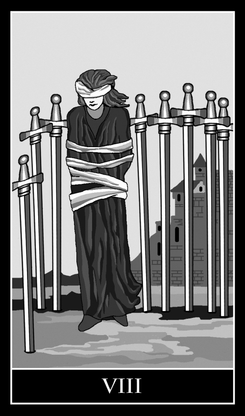 Восьмерка Мечей – достаточно интересная и глубокая в своем символизме карта. Весь ее вид передает нам ощущение скованности, напряжения, страха перед любым действием.