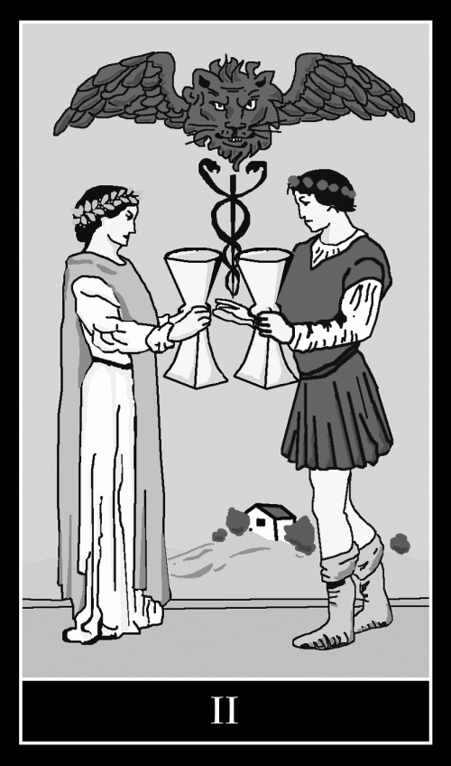 какие чувства у вас вызывает данный Аркан? Какие детали первыми вы приметили? Какие детали карты стали заметны не сразу? Как вы считаете, о чем говорит Аркан Двойка Кубков?