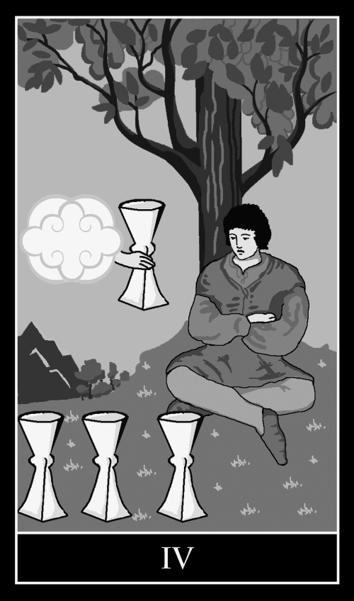 Общий визуальный ряд: юноша сидит под деревом. Его поза закрытая, действие с его стороны отсутствует, он лишь созерцает три кубка перед собой. Четвертый кубок протягивает рука, явившаяся из дымки.