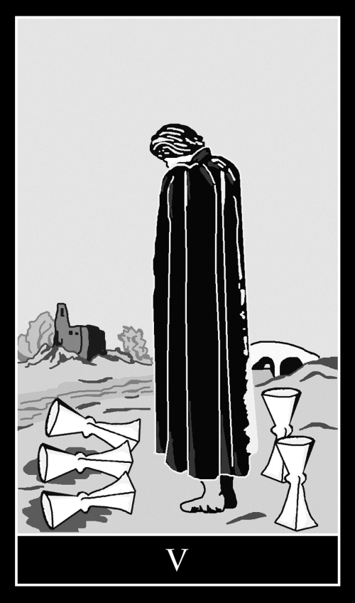 На это указывает и поза персонажа на карте, и пустоватое каменистое окружение. Лицом понурый герой обращен к павшим кубкам и пристально наблюдает, как в землю впитывается их содержимое. Эта последняя деталь очень важна для правильного понимания карты.