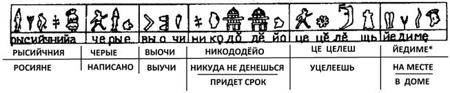 Две из приведённых надписей в) и д), на мой взгляд, нуждаются в дополнительном объяснении. В надписи в) словосочетание «СИВЁНЬНИИГАЕНИ» я представил в значении «СЕВЕРНЫЕ ГОНЦЫ» (посланники), т. е. прилетавшие с севера. Однако это значение мне не кажется единственно верным, так как слово «СИВЁНЬНИИ» может иметь значение ЛУННЫЕ от «СИВЕНЬ» (Луна/СЕ ВЕНЬ) Спутник.