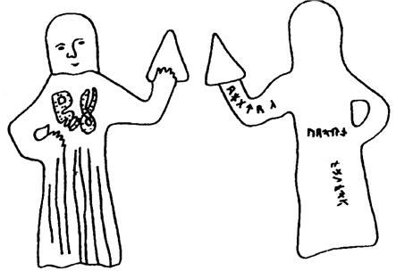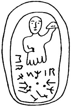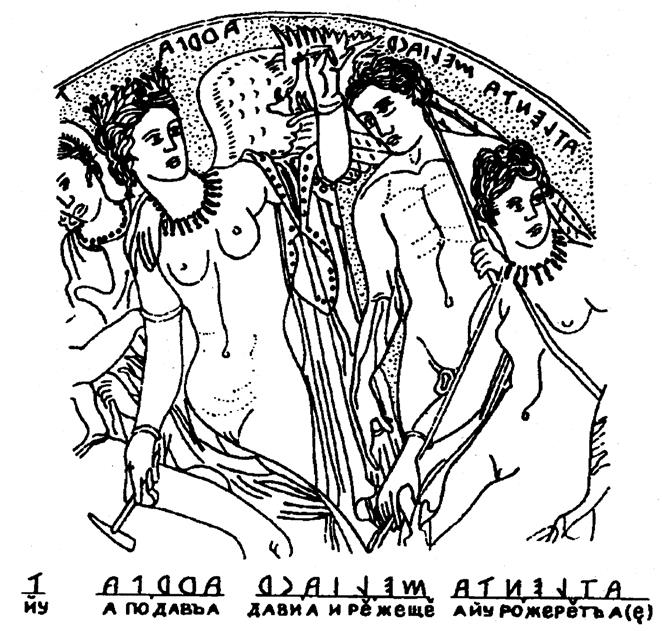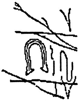 Видим безногую фигуру, одной рукой прикрывающую свой живот (живете/жизнь) со стороны печени. В другой руке, занесённой для удара, она держит треугольник с тремя точками. Это Марс отправляет три Атрея на погибель Тельцу. Созвездие Тельца изображено там, где у фигуры Марса должны быть ноги. Там же помещается надпись, охватывающая созвездие. Читаем её: «МОЙ МЕШЁНЬ ЙУНЬ СИ». Далее знак направления, стрелка которого указывает на созвездие Тельца. Знак Ш из надписи, также превращённый в стрелку, указывает туда же. Ш обозначает ЗАЩИТУ, т. е. Марс защищается.