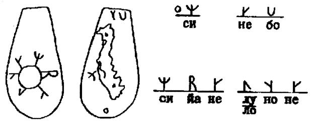 Надпись на камне каплевидной формы: с одной стороны изображён круг с торчащими из него как лучи письменными символами СИЯНИЕ ЛУННОЕ. Читаем в обратном направлении: «НЕ НАЛУНЯЙСЯ»! Вот молодец писавший! Только что мы читали о том, как «налунились», так что чуть не захлебнулись. Поистине велик и могуч русский язык, а русские мозги – это нечто!