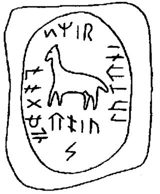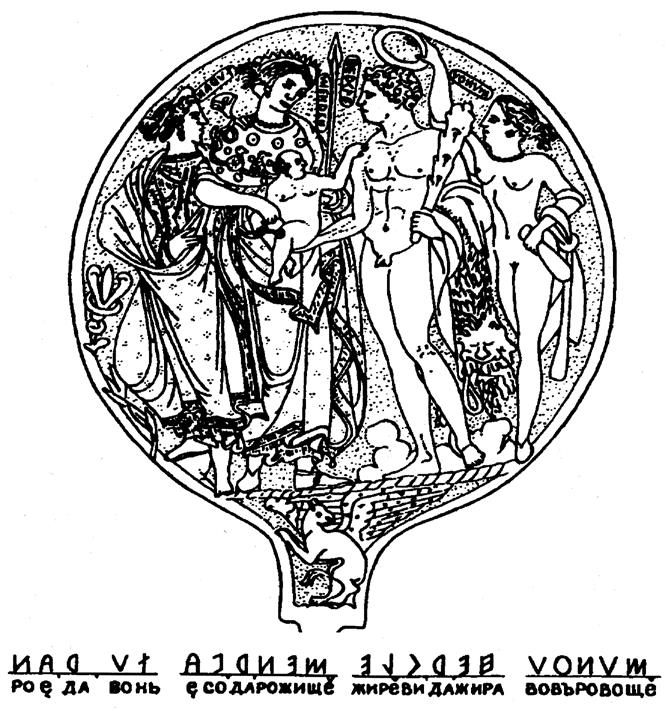 На нём лошадка, вокруг которой надпись. Сверху написано «РОСИЙ ЙА» Под лошадкой – «ПНИЛО», т. е. пинающая/ лягающаяся (ягающая). Ещё ниже – знак Перун (руническая ЗИГА), читается как «РО». Слева от лошади: «На НиЗуБоПоЛа/упало на пол (поверхность).