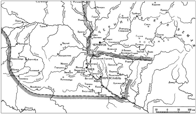 Доставшаяся Всеволоду небольшая Переяславская волость была первым и единственным на то время русским княжеством, сформировавшимся вне границ определенного племенного образования, благодаря целенаправленным усилиям княжеской власти[27]. В известном смысле удел Всеволода представлял собой древнерусский аналог пограничной франко-германской марки, заселенной военно-торговым людом. В политическом отношении Переяславская земля была тесно связана с киевским правобережьем, образуя вместе с ним мощный оборонительный заслон против вторжений степняков[28]. Военно-стратегическое значение Переяславского княжества обусловило неравномерное размещение в нем городов и укрепленных поселений, сосредоточенных преимущественно в двух районах: на юго-восточном пограничье, вдоль Сулы (крайняя восточная линия Змиевых валов), и ближе к Киеву, на северо-западе (по Трубежу и Супою), где, собственно, и концентрировались основные военные силы княжества[29]. Чтобы усилить довольно скудные материальные ресурсы Переяславля, Всеволоду, по сообщению Новгородской Первой летописи, выделили для сбора дани изрядную полосу земель на северо-востоке – Ростов, Суздаль, Белоозеро, Поволжье.