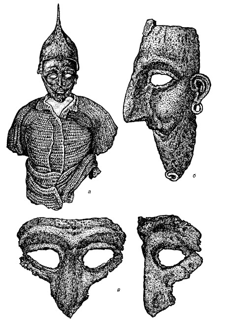 а – железный шлем с маской и кольчугой из погребения у села Ковали Черкасской области; б – профиль маски у села Ковали; в – железная полумаска из села Вщиж Брянской области