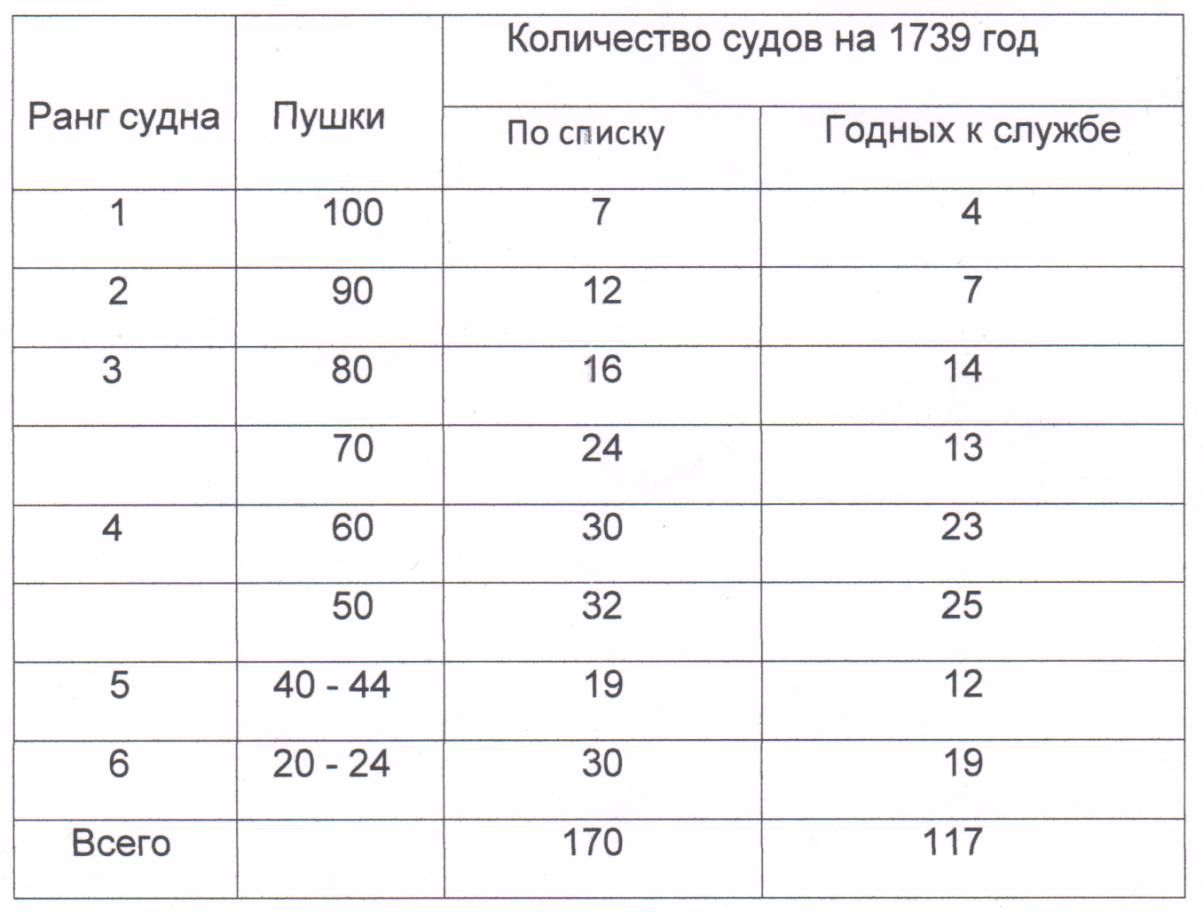 К лету 1739 года в британском флоте по бумагам числились 121 линейный корабль и 49 фрегатов. Из этого огромного количества судов только 86 кораблей и 31 фрегат могли быть использованы в военных действиях. (Приложение 1)