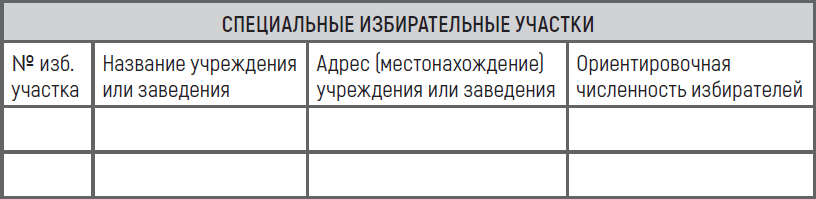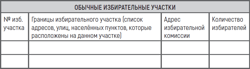 На одном или двух страницах формата А4 в таблицу заносятся все сведения об избирательном участке, которые могут пригодиться в процессе работы. Даже если таких избирательных участков может набраться несколько десятков, анализ следует провести по каждому из них. Перечислим пункты, которые могут быть включены в паспорт избирательного участка. Это: