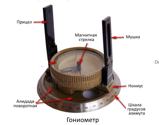 Гониометр ГР —прибор, состоящий из двух имеющих общую вертикальную ось металлических цилиндров различного диаметра с узкими щелями-диоптрами для визирования и коническим переходом. На конической поверхности нижнего цилиндра нанесена шкала лимба, верхнего – два диаметрально противоположных друг другу верньера. Нижний цилиндр имеет отверстие для крепления на штатив или вешку. На торце подвижного верхнего цилиндра укреплена круглая буссоль ( Компас повышенной точности ).