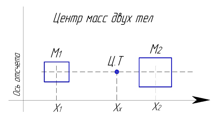 Определение координат центра масс нескольких тел производим методом последовательного добавления к уже определенной суммарной массе нескольких тел – еще одной массы. Начинаем с определения центра масс двух тел М1 и М2. Находим суммарную массу дух тел и координаты центра масс этих двух тел в точке Хх. Далее считаем, что сумма масс двух тел сосредоточена в точке центра масс с координатами Хх. Считаем что получившееся суммарное тело – это тело № М3. Затем добавляем к нему еще одно тело № М4. Снова получаем задачу по определению центра масс двух тел № М3 и № М4. Находим координаты новой точки центра масс. Программа позволяет добавлять к уже определенному суммарному телу еще одно тело столько раз – сколько необходимо.