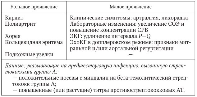 Наличие двух больших критериев или одного большого и двух малых критериев в сочетании с данными, подтверждающими предшествовавшую инфекцию, вызванную стрепток окками группы А, свидетельствует о высокой вероятности ОРЛ.