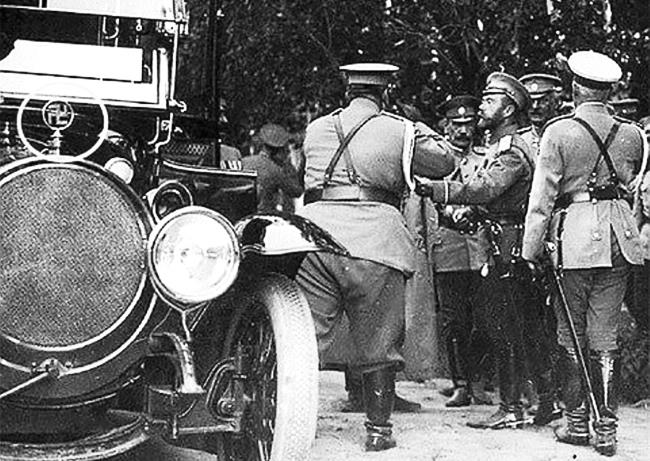 Император Николай II и князь В.Н. Орлов (слева от Него, спиной к зрителю) у Царского автомобиля с гамматическом крестом на капоте