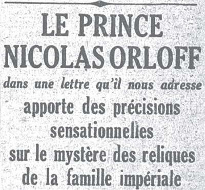 В прошлой главе мы писали о том, что в составе серии статей французского журналиста Ксавье де Отеклока «Что стало с Русским Царем», вышедших 1930–1931 гг. в парижской газете «Petit Journal», 11 января 1931 г. было опубликовано письмо князя Н.В. Орлова «Le prince Nicolas Orloff dans une lettre qu'il nous adresse apporte des precisions sensationnelles sur le mystere des reliques de la famille imperiale».
