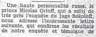 Князь Орлов: Со времени приезда Соколова во Францию я был его ближайшим сотрудником. Мы вместе пересмотрели, руководясь самым тщательным критическим анализом, все данные его следствия, которое – я могу громко заявить – было ведено по всем правилам нашей юриспруденции. Я нахожу, что с юридической точки зрения это следствие вполне правильно, а его результаты вполне убедительны.