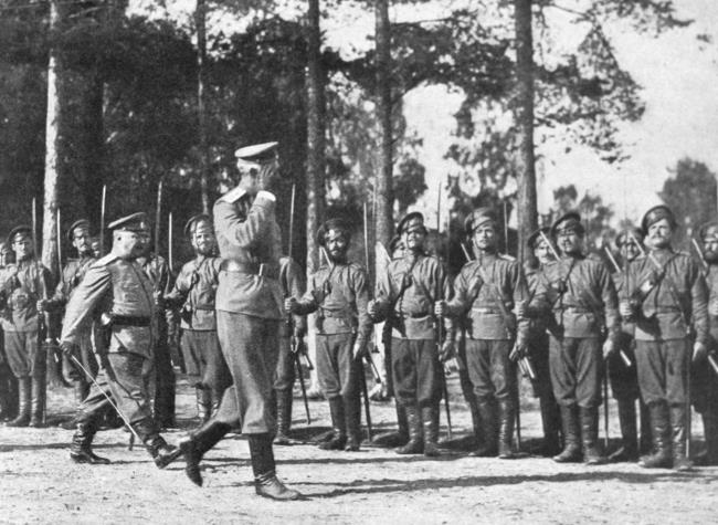 Великий Князь Николай Николаевич обходит строй казаков в сопровождении князя В.Н. Орлова. Ставка. 1915 г.