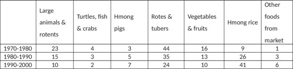 The Mlabri are still practicing hunting and gathering today, but it is much more limited. Mlabri’s consumption of food directly hunted or gathered from the forest has decreased since 1970s and at present amounts to only 7% of average food weight. Under the influence of cash economy, they sometimes sell the the games to the Hmong because they can get more food from that amount of money. The money or bought food is sharing according to the traditional social principle of sharing (Nimonjiya 2015).