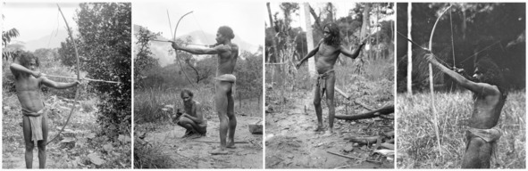 Males started to learn the skills of tracking and hunting around the age of ten to eleven years. A boy was given his first bow as soon as he has been able to hold one (around three years old). This type of bow was basically built on the same principle as the slingshot; it was strung with two cords, connected at the centre by a one centimeter wide woven fiber mat. A small stone was placed in the mat and firmly gripped between the thumb and the fingers. When they were eight to nine years old they collected honey together. At the age of eleven, twelve or thirteen years, a boy started to accompany his father on one-day hunting trips.