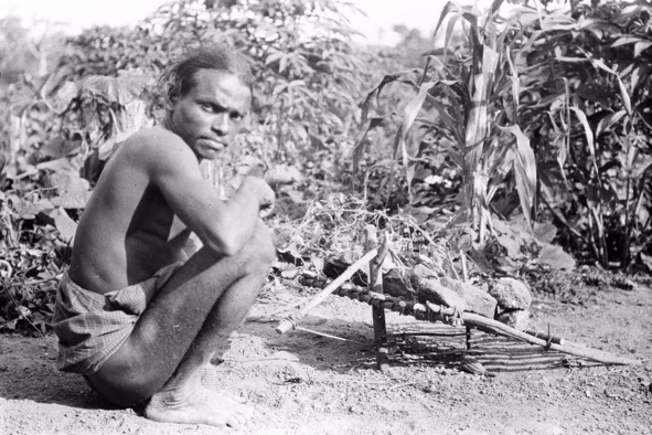 The soil is poor and unproductive. But the Wanniyala-aetto plant many different grains, vegetables and tubers. Most of the Wanniyala-aetto clear a piece of land close to the house to do swidden cultivation of maize and “kurakkan” millet (Eleusine coracana). This type of cultivation is practiced by both Sinhalese and Tamil small scale farmers and is called “chena”. An enormous fence surrounding the chena must resist the elephants, be taller than the sambhur’s leap and tight enough to keep out the hares. Staples include maize, finger millet (Eleusine coracana) and dryland rice. They obtain wetland rice from Sinhalese shops. Maize is sown just before the monsoon in mid-September, followed by kurakkan in October, and it is time for the boys to make use of the double-stringed bow – they guard the chena from birds, then sambhur who is looking for a taller plants, and wild boars seeking roots. The chena can’t be cultivated for more than two to three years – then it must lie fallow for ten to twelve consecutive years (Spittel 1950).