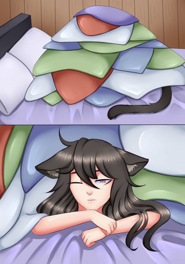 Поправив выбившиеся пряди длинных тёмно-русых волос, девушка шевельнула небольшими кошачьими ушками и уставилась на гостя, так и не выбравшись из-под одеял.