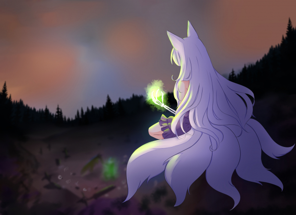 На край ледяного кольца плавно спланировала красивая девушка со стоящими торчком лисьими ушками, а слегка светящиеся в темноте серебристые волосы на фоне тёмного леса придавали образу кицунэ волшебности. Этому же способствовали пять пушистых хвостов с роскошным серебристым мехом. Девушка держала перед носом тлеющую щепку, вдыхая аромат горящей древесины, но всё равно с её лица не пропадало выражение омерзения и презрения.