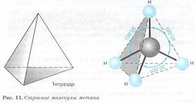 В кристалле алмаза каждый атом находится на равном удалении от четырёх соседних, которые образуют правильный тетраэдр. В молекуле метана атом углерода находится в центре правильного тетраэдра, вершинами которого являются атомы водорода. Не спаренные электроны располагаются в электронном облаке на равном удалении друг от друга и имеют угол отхождения электрон – ядро – электрон, равный 109о28!. Этот угол сохраняется во всех соединениях углерода.