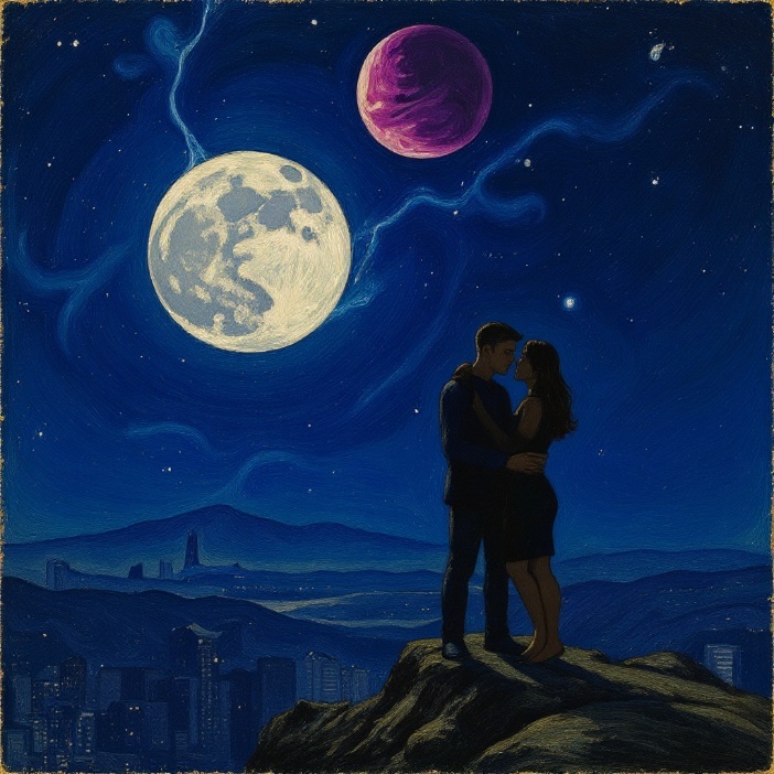 Новая планета образовывало красивейшие ночные пейзажи. От фиолетового диска в центре Луны, разливались красивые пурпурные лучи по ночному небу. Облака и тучи тоже отражали фиолетовый свет, а по водной глади морей и рек, ночью переливались красивые, с фиолетовым сиянием, волны. Зрелище было необыкновенно красивым.
