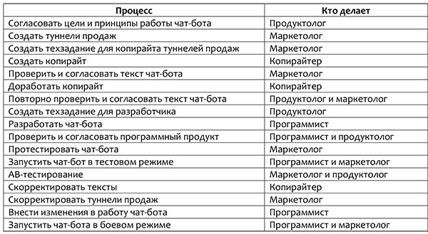 В среднем группа специалистов создает чат-бот в течение двух месяцев. Стоимость их работы начинается от 10 000 долларов. Задействовать же одного человека для разработки качественного продукта нецелесообразно, поскольку спектр работ очень большой (см. табл. 1).