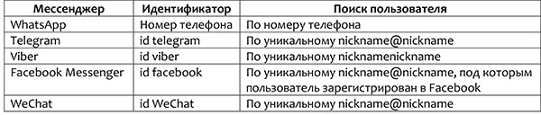 Идентификатором является телефонный номер пользователя. У остальных мессенджеров номер – не основной параметр, а некое дополнительное поле, которое не всегда предоставляется для собеседников. Посмотрите в таблице 2, как работают идентификаторы у разных мессенджеров.