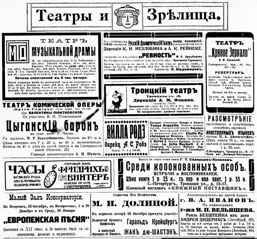 Афиша петербургских театров. 1910 г. Из журнала «Солнце России»