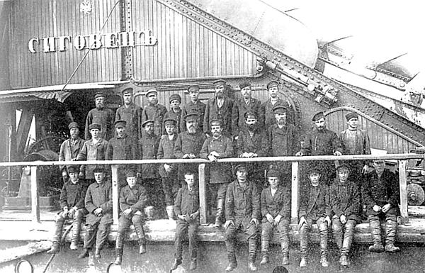 Ладожский канал. Группа инженеров и рабочих на борту землечерпалки «Сиговец». Фото 1908 года
