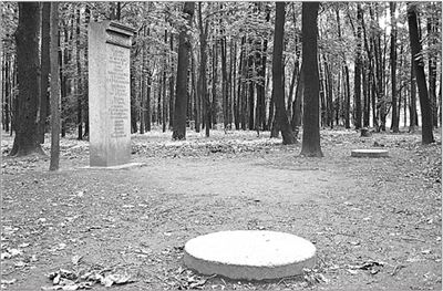 Памятник на месте дуэли в парке Лесотехнического университета. Круглые плиты отмечают позиции, где стояли дуэлянты