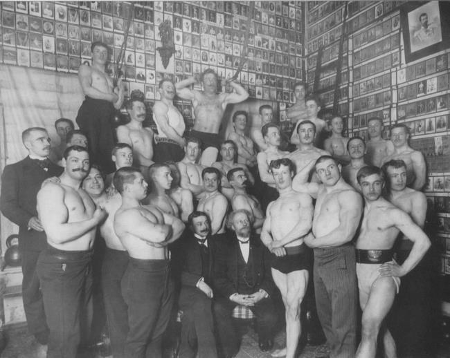Участники С.-Петербургского велосипедно-атлетического общества в атлетическом кабинете доктора Краевского на Михайловской площади. В нижнем ряду в центре – председатель общества Владислав Францевич Краевский. Начало 1900-х гг. Фотограф Карл Булла