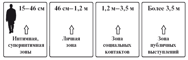 С. Горин: А теперь – для чего это делалось. Сравните своё отношение к Алле до упражнения и после него. Вот это и было сделано в школе. Хорошо, теперь давайте поговорим о дистанциях общения. О личных пространствах человека вы знаете (см. схему), вопрос в том, как это можно использовать.