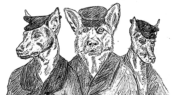 Мы уже почти достигли домов по другую сторону улицы, когда из подворотни вышли два добермана и одна немецкая овчарка. Точнее, доберман, доберманиха и овчар. Все трое были одеты в чёрные плащи, а на головы натянуты чёрные кожаные фуражки.