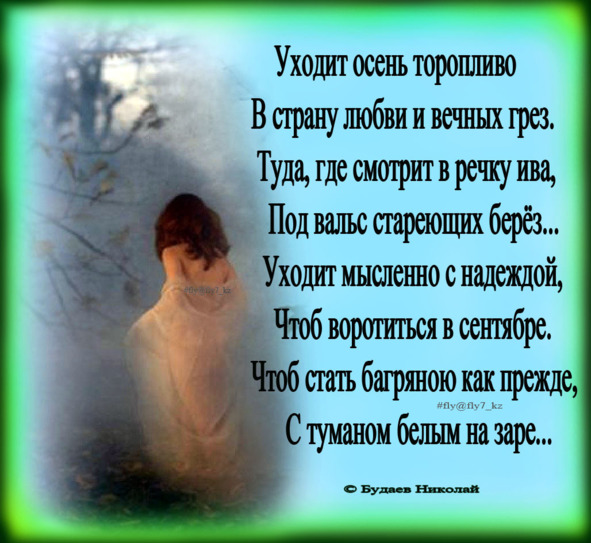 В листопаде качается осень, Расстилая нарядный покров.В сером небе мелькнувшая просинь,Потревожит покой будних снов. Ты возьми меня осень с собою,Пусть останутся в прошлом дожди!С ярко-жёлтой опавшей листвою,Ты меня обними, закружи!С голых веток последние листья,В вальсе тихо ложатся в траву. Осень, долго ты будешь мне сниться, Как кружили с тобой наяву!Разгулявшийся ветер подхватит,Листопад нас пускай заметёт!Мы не скажем конечно же-хватит!Вместе нас пусть в обнимку несёт!