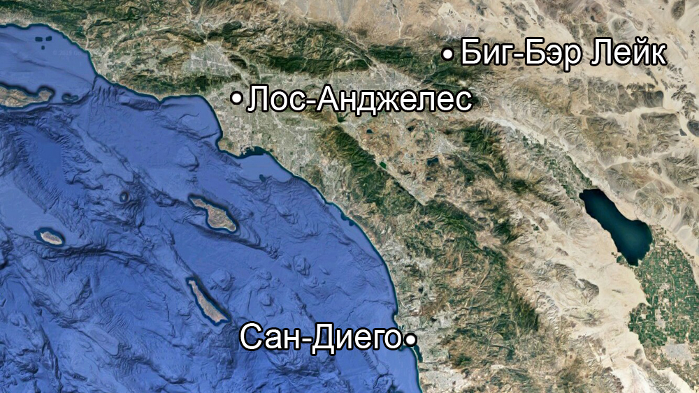 Мой путь лежал в городок Биг-Бэр Лейк (Англ. Big Bear Lake – озеро большого медведя), и выбрал я его не просто так. Место это знаменито своими горнолыжными курортами, на одном из которых располагается один из лучших в мире сноупарков. Летом снега там, конечно, не было, но мне просто хотелось побывать в этом примечательном для меня месте, ведь я просматривал сноубордические видео из этого парка на протяжении многих лет. Вообще, калифорнийская природа уникальна. Зимой в здешних горах лежит снег, а запрыгнув в автомобиль, за несколько часов можно доехать до солнечного океанского побережья. Не так-то много в мире мест, где в течение одного дня можно покататься и на сноуборде, и на серфе.