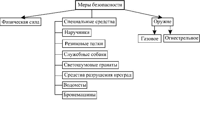 В случаях массовых беспорядков, злостного неповиновения законным требованиям персонала исправительных учреждений, оказания сопротивления персоналу, проявления буйства, захвата заложников, нападений на граждан, при побеге или задержании бежавших осужденных, в целях пресечения указанных противоправных действий сотрудниками уголовно-исполнительной системы могут применяться такие меры безопасности, как физическая сила, специальные средства, газовое и огнестрельное оружие. К специальным средствам относятся резиновые палки, наручники, служебные собаки, светошумовые гранаты, средства разрушения преград, водометы, бронемашины. Основания применения мер безопасности определены в ст. 86 УИК РФ, а общие требования к их применению и порядок применения – в ст. 28–31 Закона «Об учреждениях и органах, исполняющих уголовные наказания в виде лишения свободы».