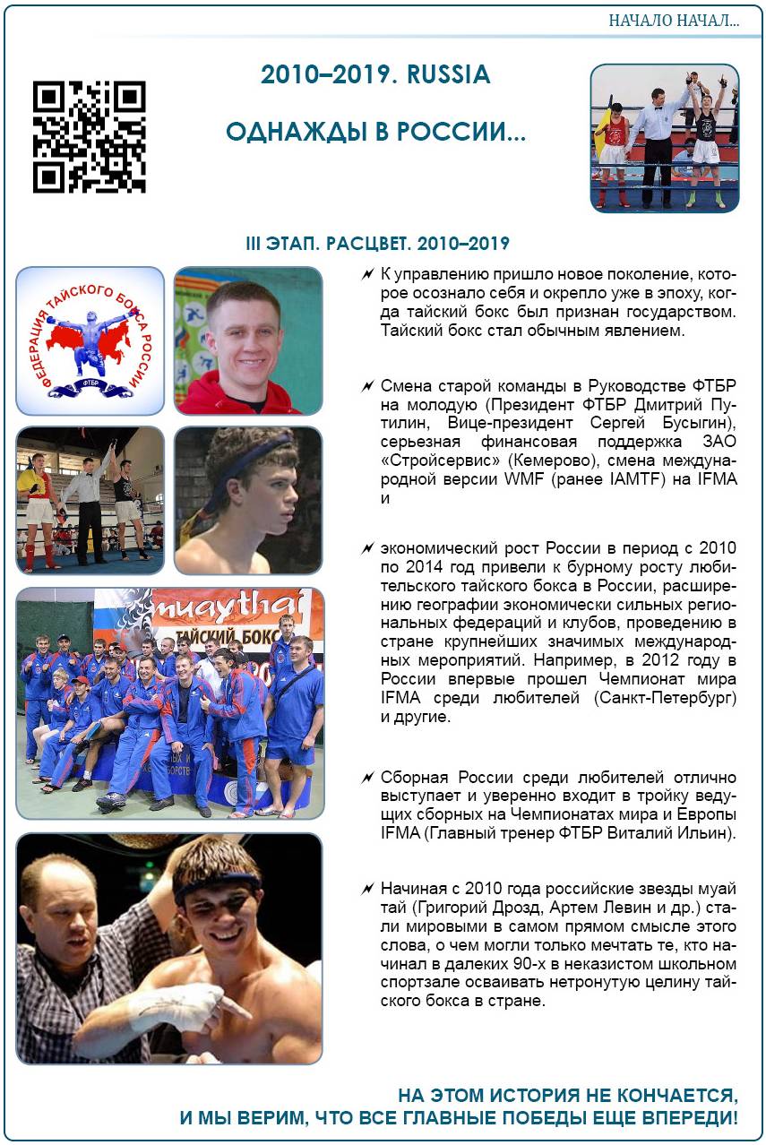 I и II этапы – эпоха энтузиастов (см. видео), вкладывающих свой труд и свои деньги в развитие нового, подчас экзотичного для обывателей вида спорта – тайского бокса (см. видео).
