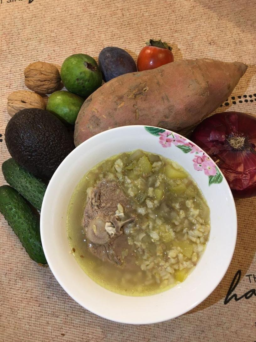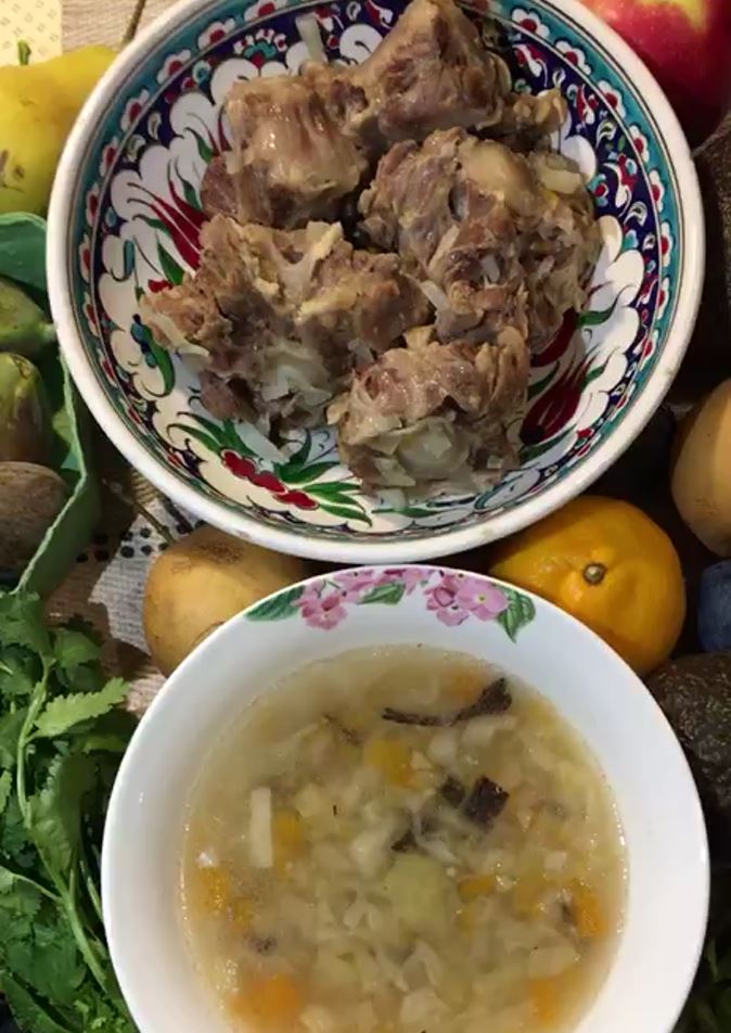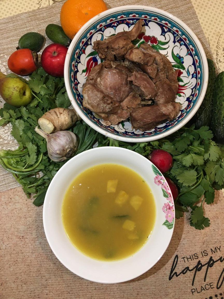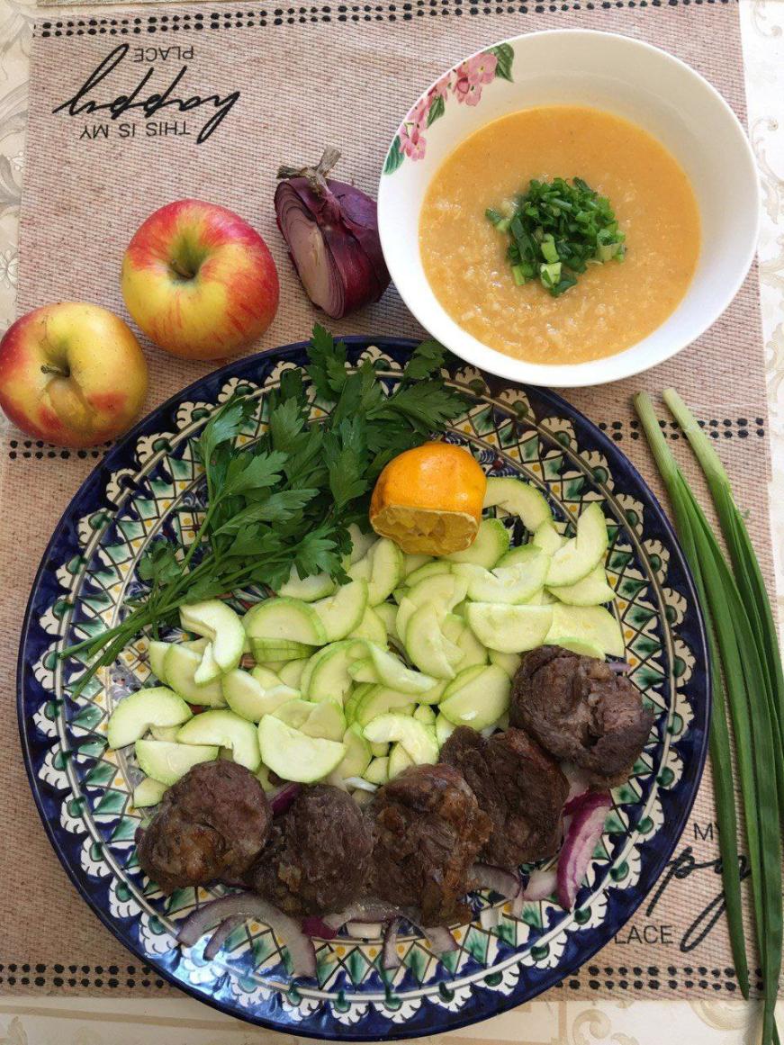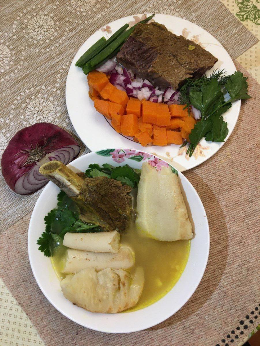 Суп из батата и зеленого лука на бульоне из костей индейки, запеченая говядина (шея) на подушке из лука