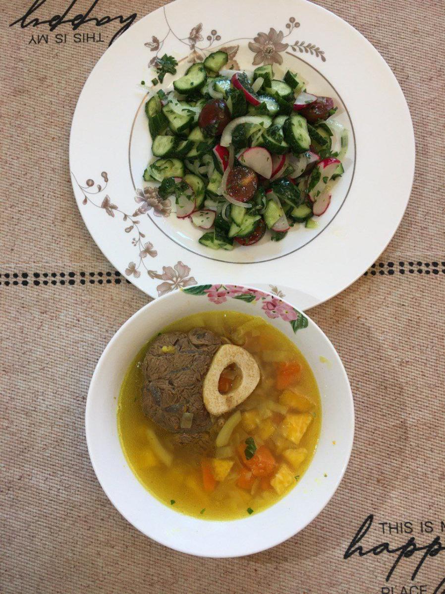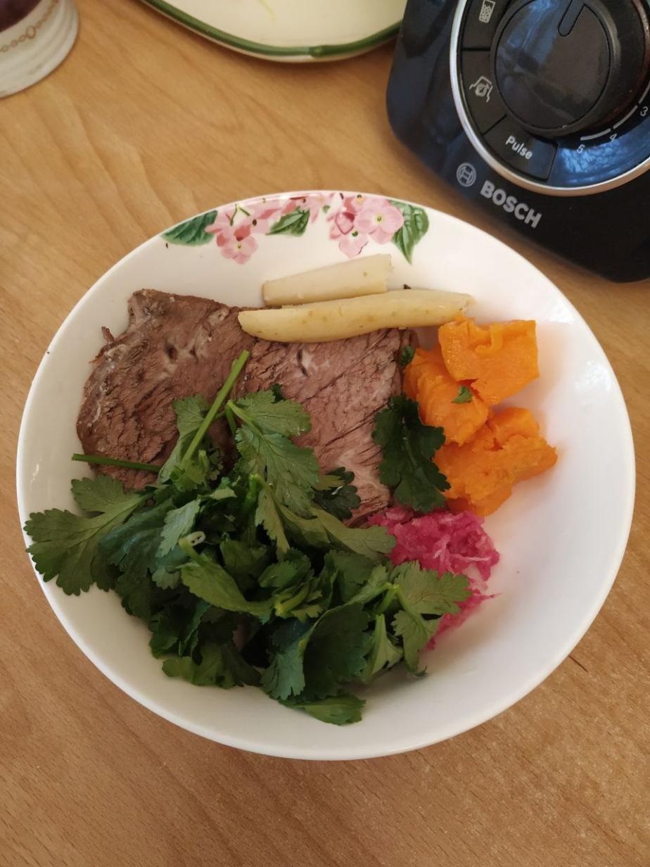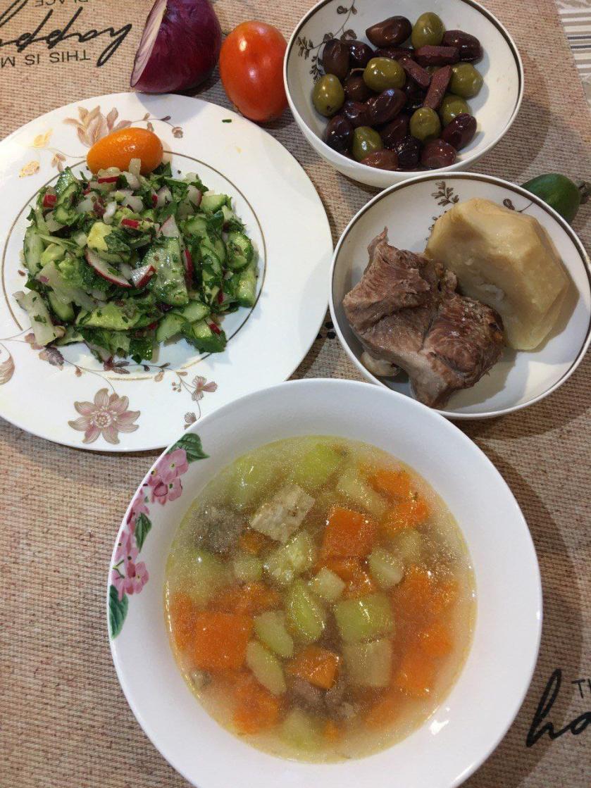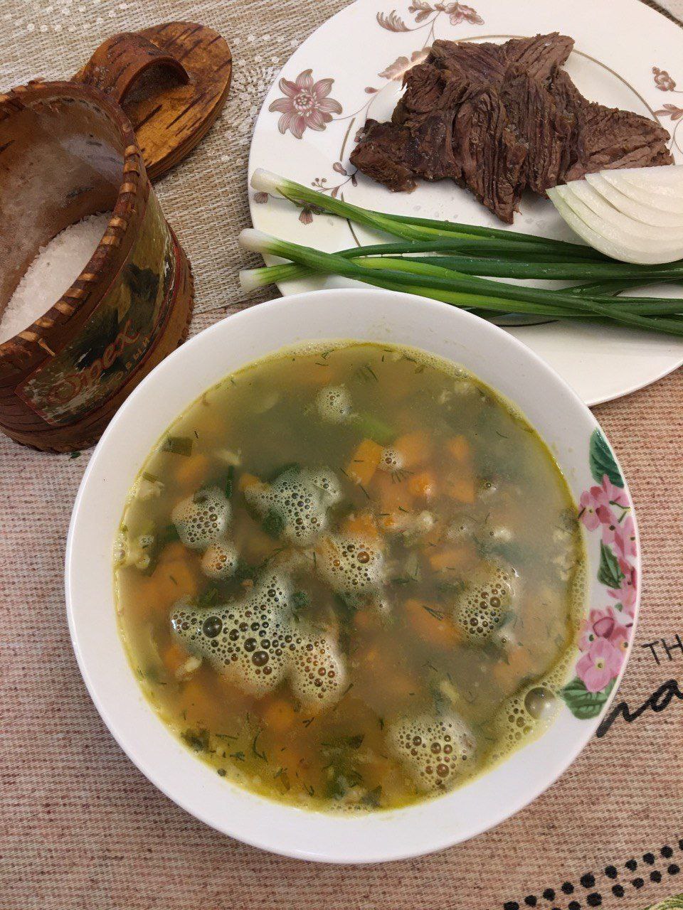 Суп из батата и зеленого лука на бульоне из костей индейки, запеченая говядина (шея) на подушке из лука