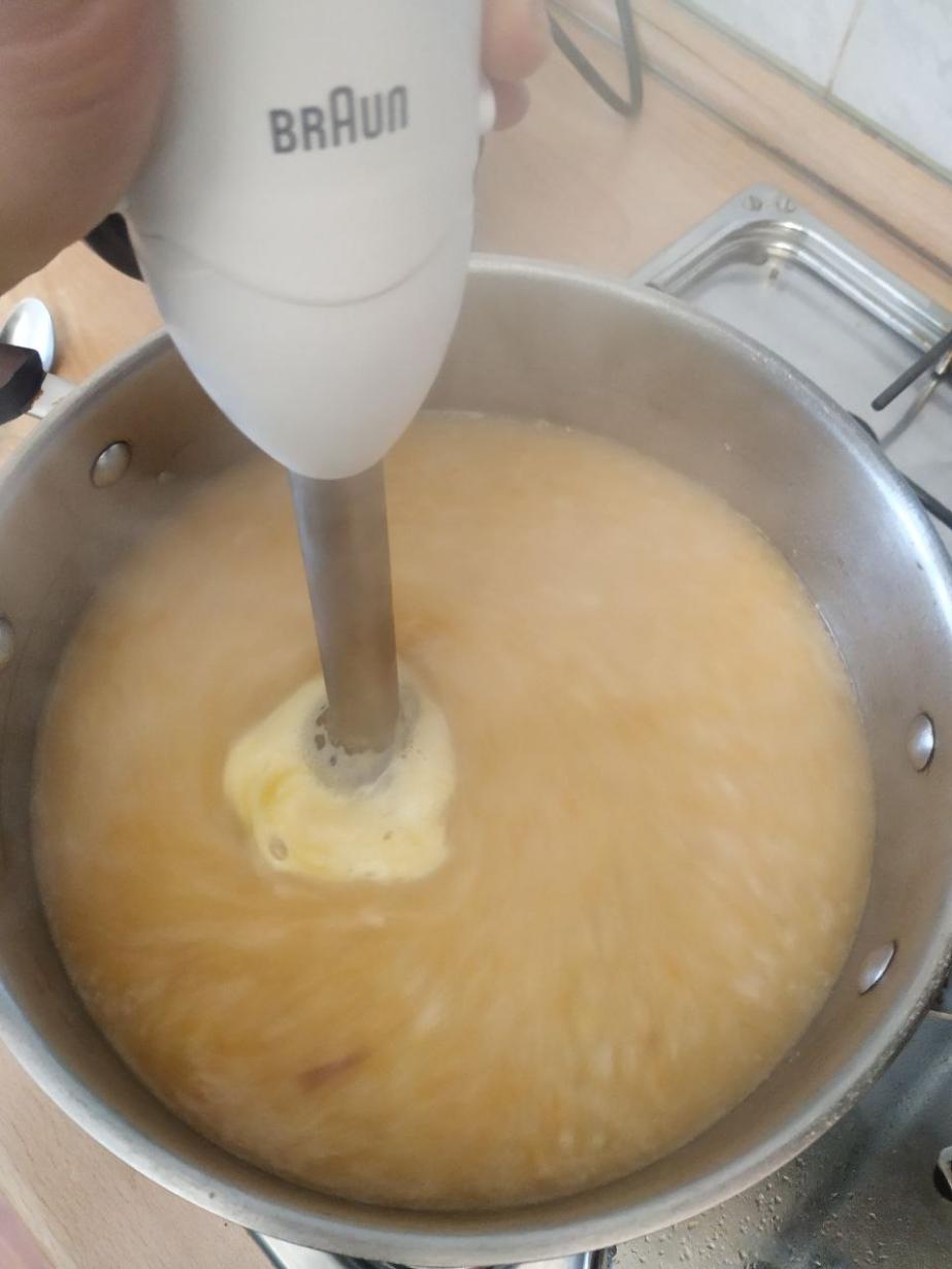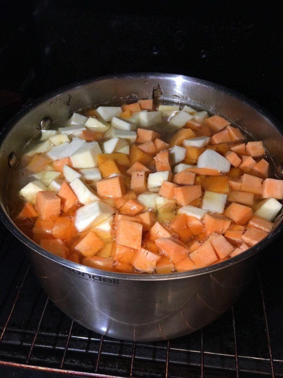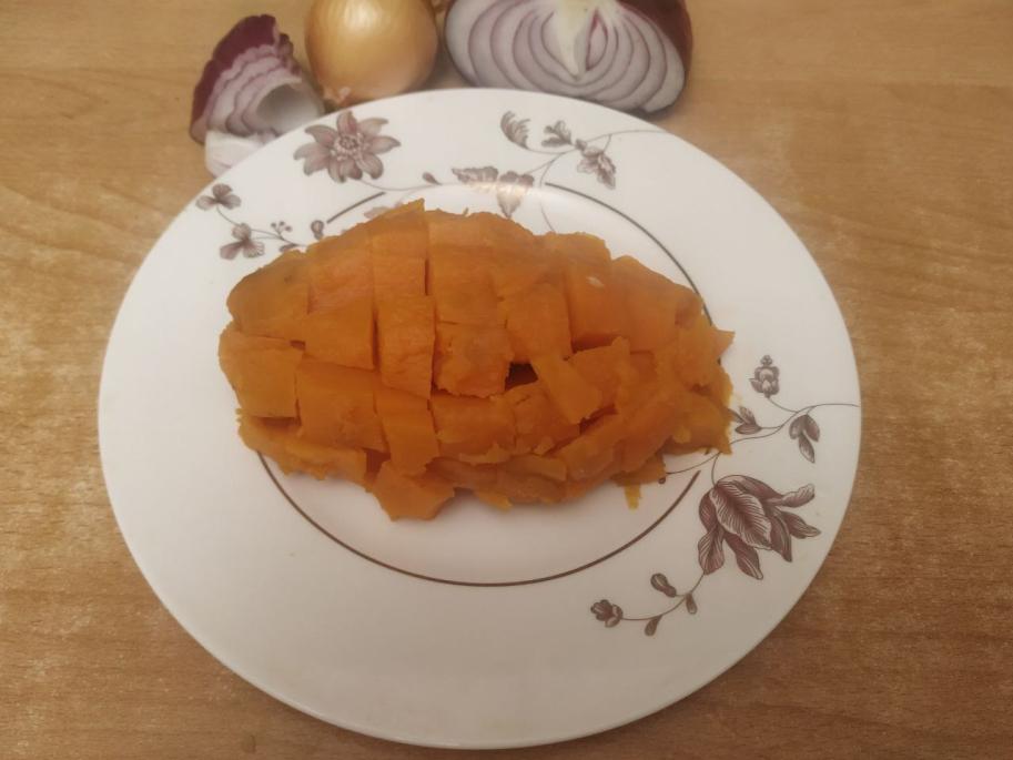 – бульон доливаем кипятком из чайника, бросаем мелко нарезанный кубиками батат и варим 5 минут