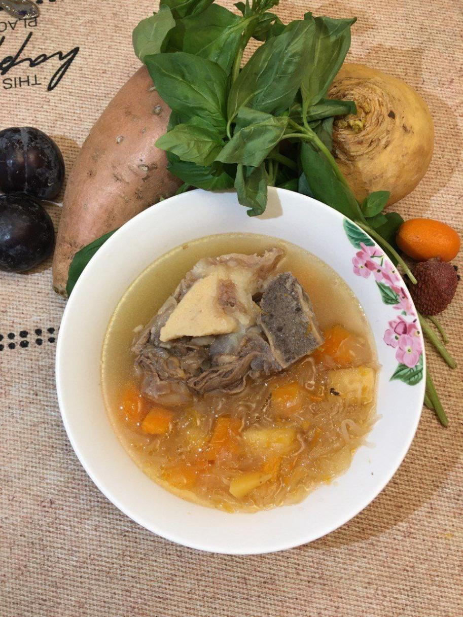 Суп из говяжьих хвостов по-испански со свежей капустой и тыквой в стиле фьюжн.