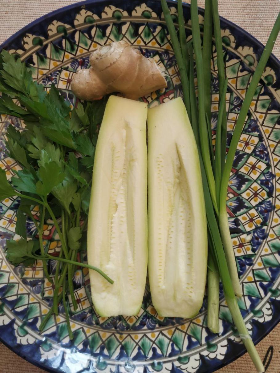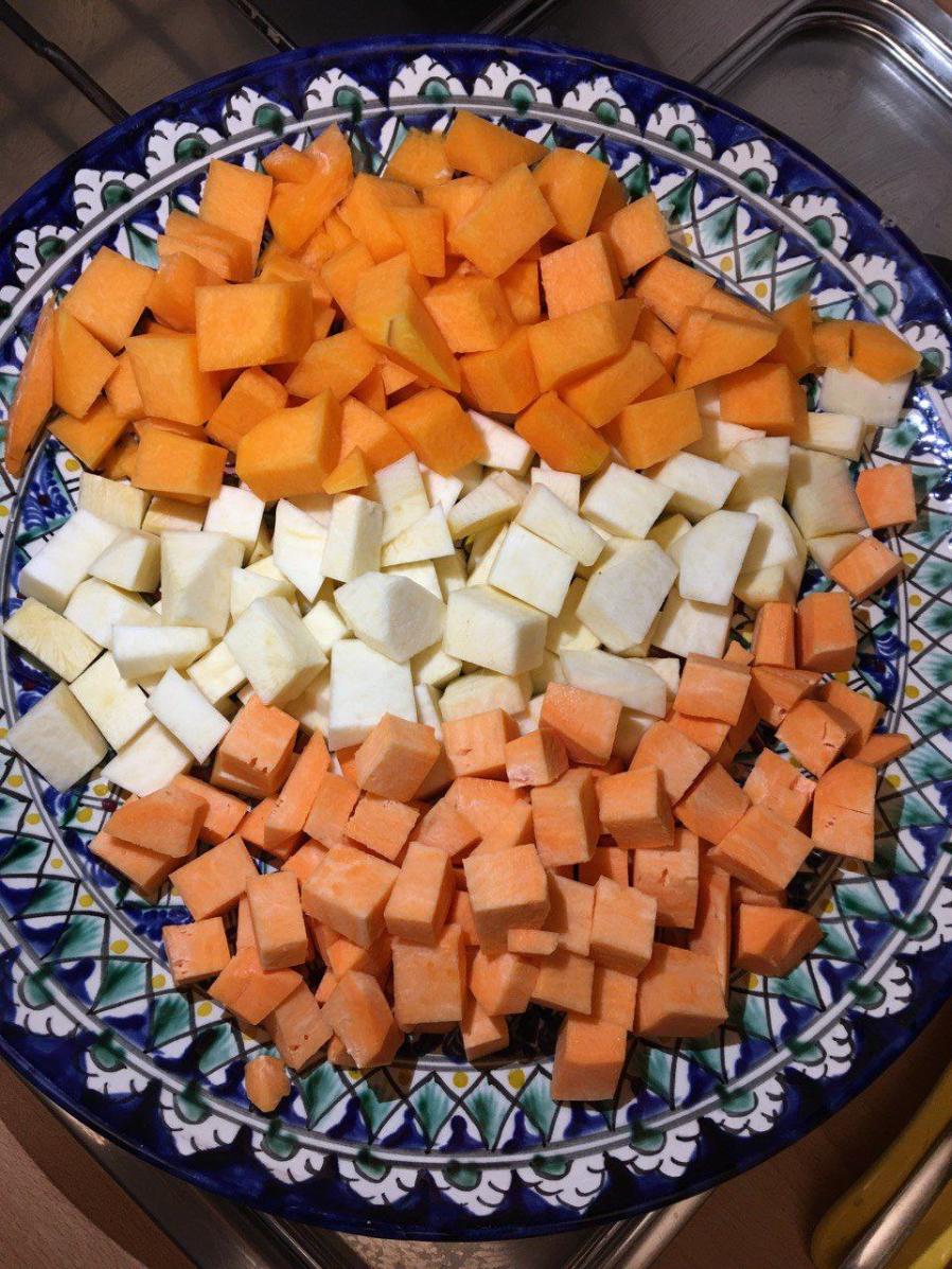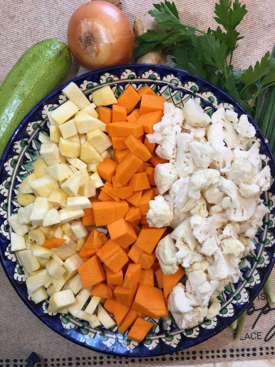 Пряный суп из казылыка с бататом, репой, корнем сельдерея, тыквой, кабачком и цукини.