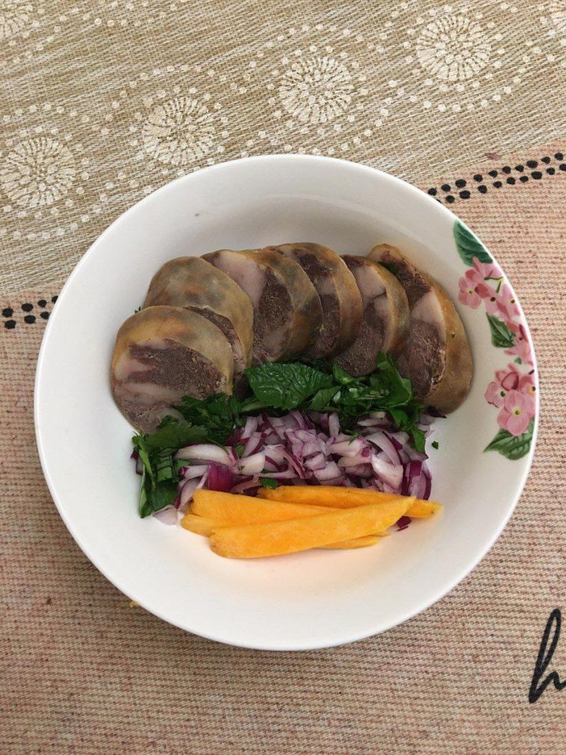 – "элеш" – поперек волокон нарезаем ломти мяса, кладем в плоскую тарелку вместе с половинкой хрусткой сочной луковицы и перьями ядреного зеленого лука и посыпаем крупной солью.