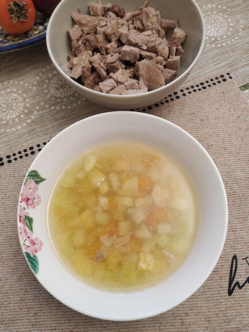 Сборный суп из говяжей мозговой косточки, грудки индейки, тыквы и кабачков.