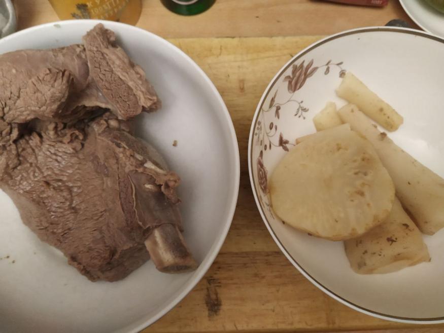 Рядом ставим большую миску с кусками мяса и вареными корнеплодами.