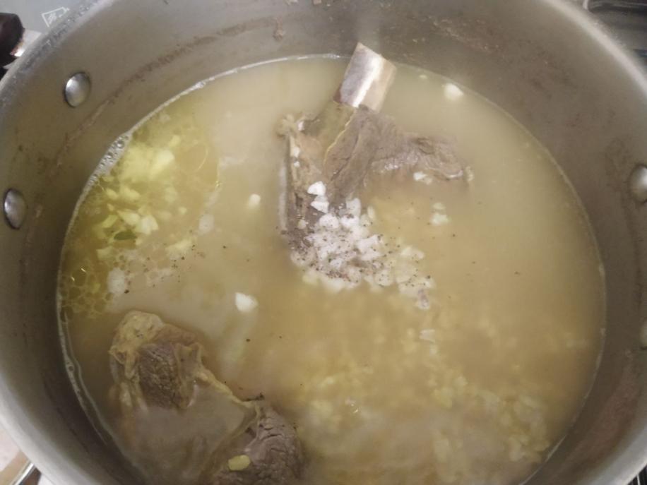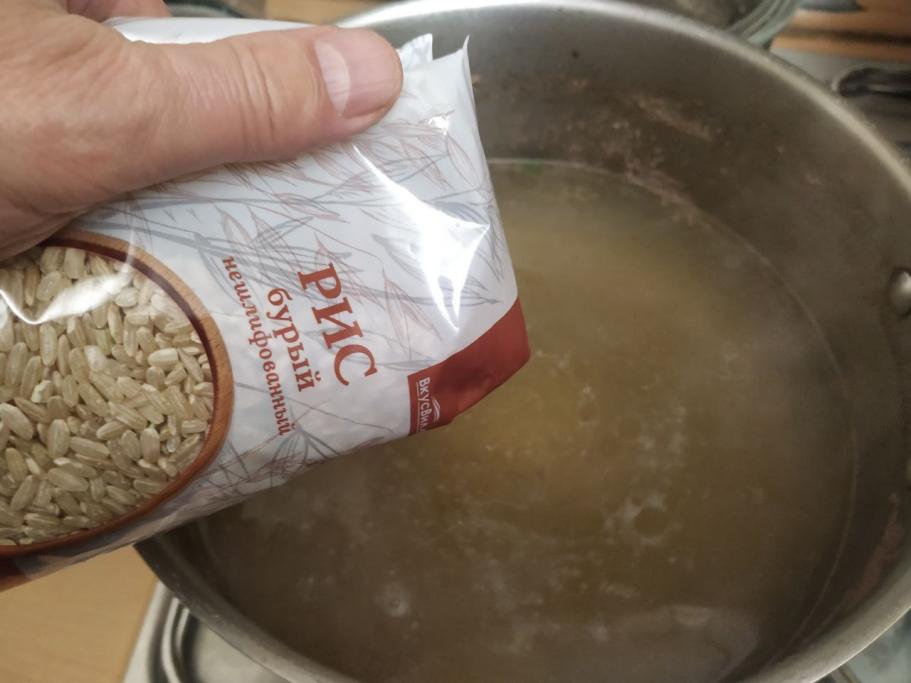Суп с говядиной (мозговая косточка), шпинатом и бурым рисом.