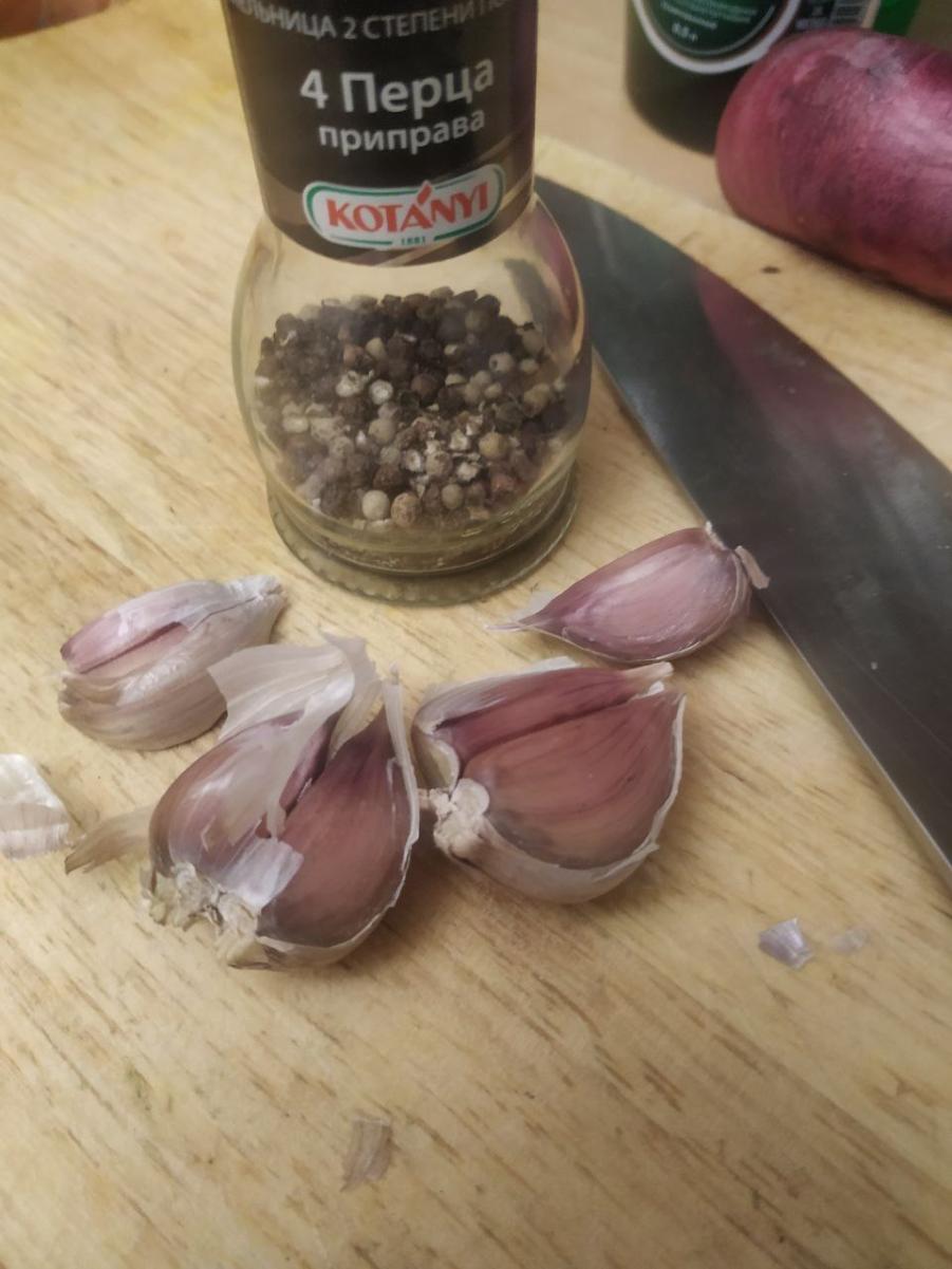 Давим дольки чеснока, заливаем маслом и солим, даём настояться 3 минуты.