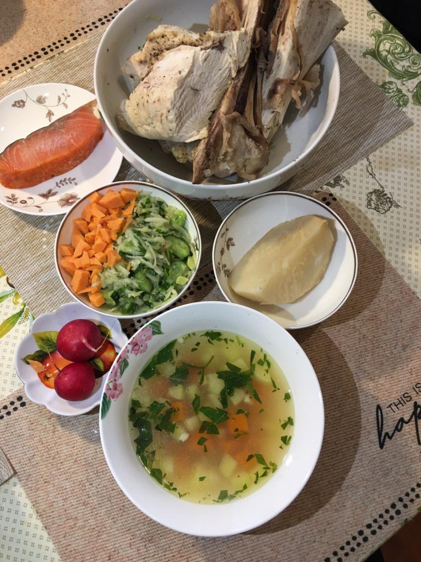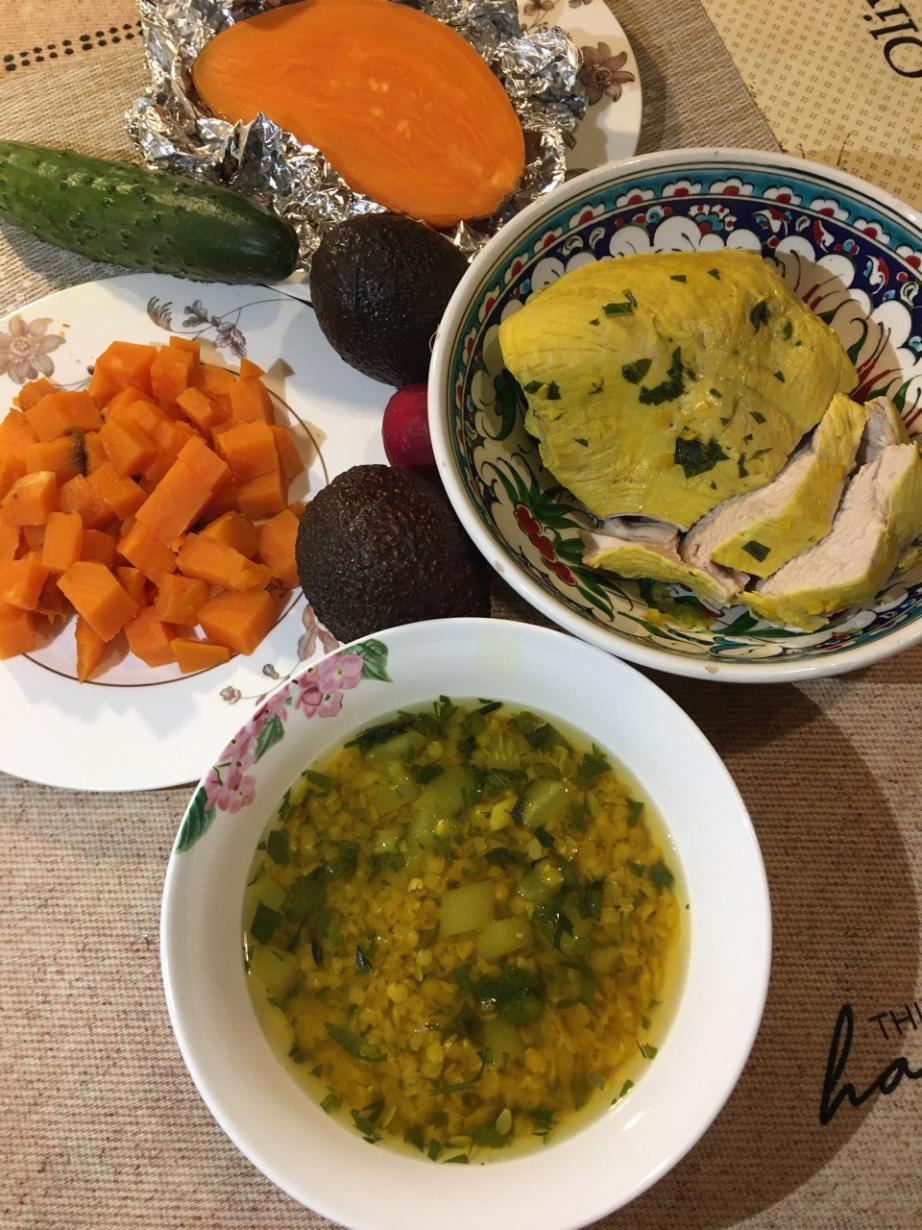 Суп из индейки. Запеченный батат.