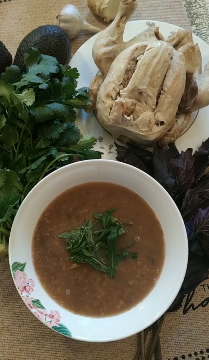 – "суп" – на дно глубокой тарелки, руками рвем зелень мяты, зеленого базилика и кинзы и наливаем бульон (кипяток),